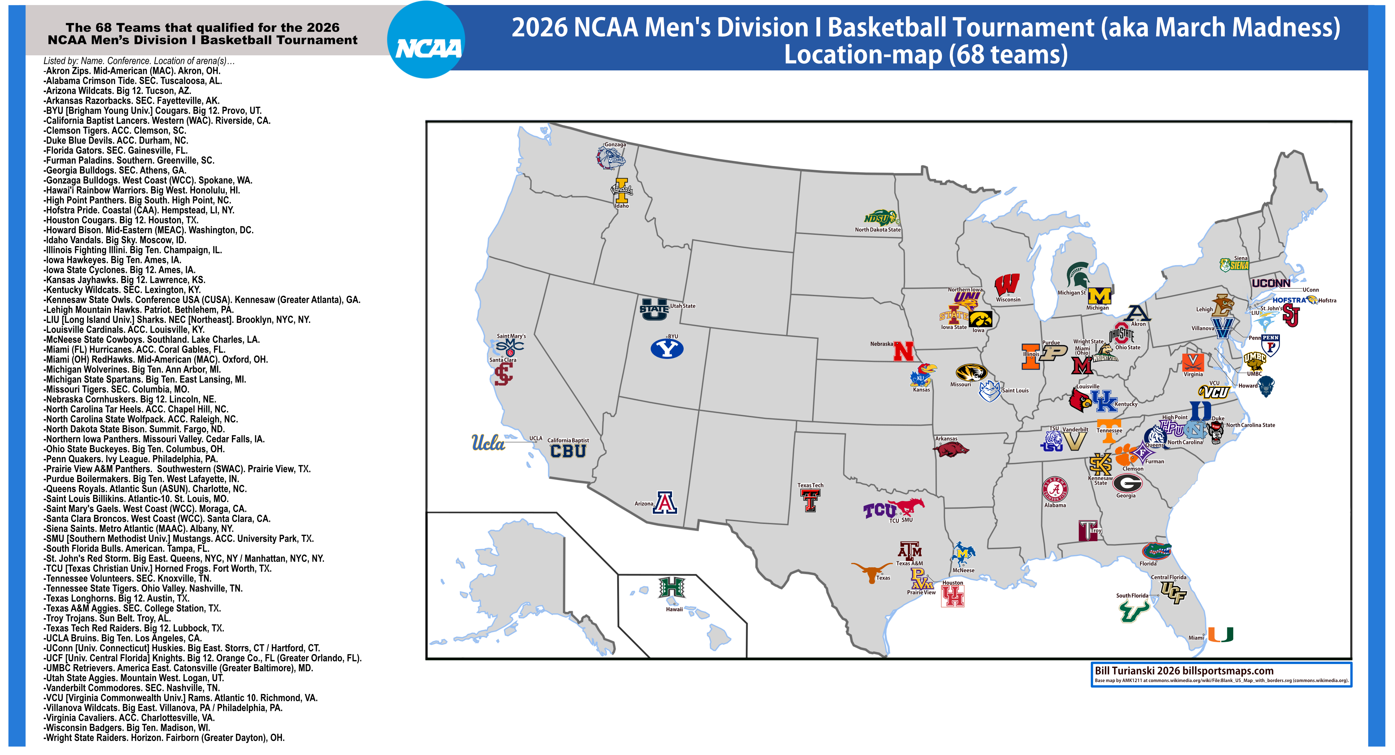 The 68 Teams which qualified for the 2026 NCAA Men’s Division I Basketball Tournament [aka March Madness]