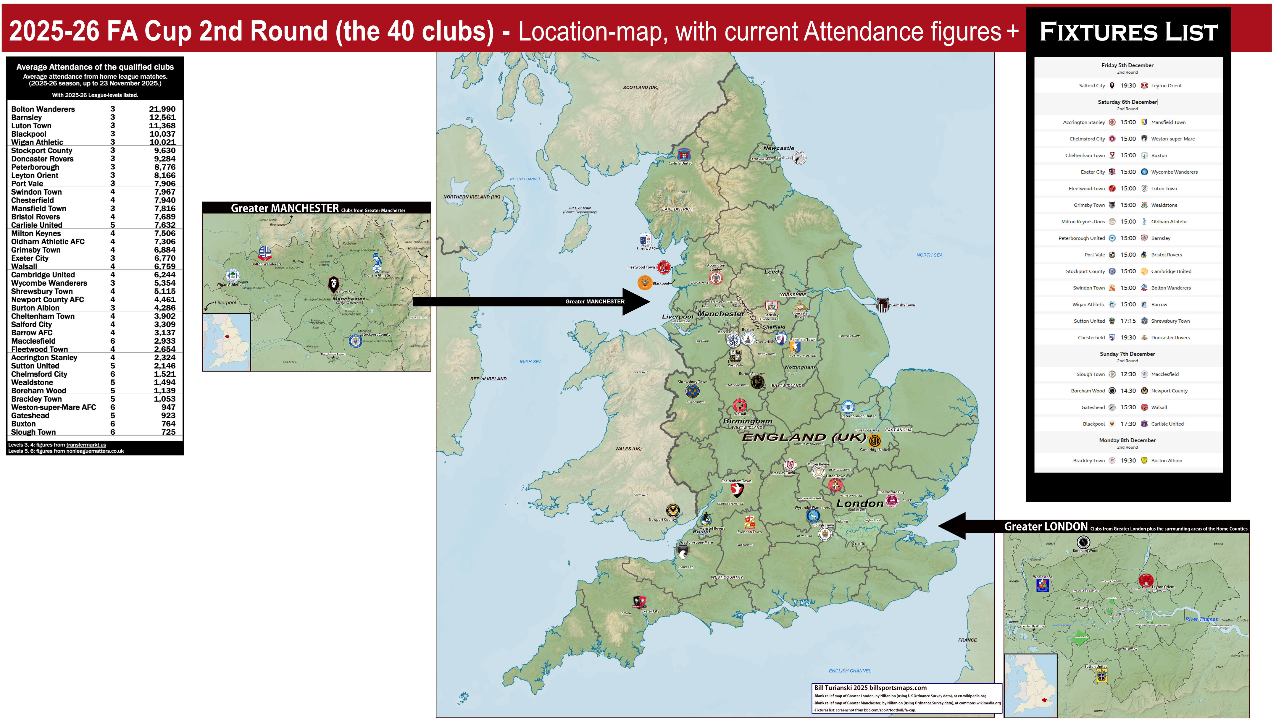 2025-26 FA Cup, 2nd Round (the 40 clubs): Location-map, with fixtures list & current league attendances.
